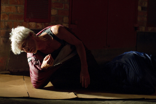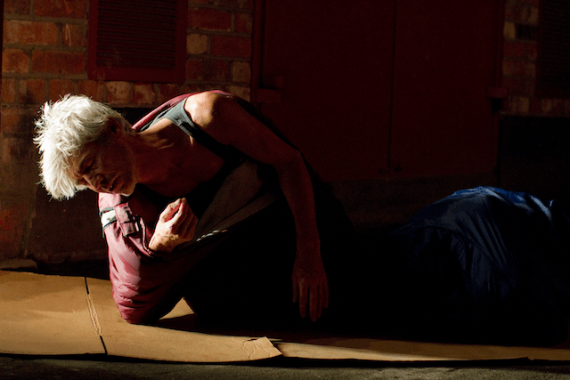 Scaife’s decision to take Beckett’s mime from the intimate space of the stage to public outdoor spaces foregrounds the ethical resonance of the work because, as the director explains, these are the places ‘where the homeless spend their time’. Beckett’s A and B become two homeless men, living rough, their lives circumscribed by the monotony of daily routine, goaded into action by the point of a stick wielded by some unknown, like the bell that wakes Winnie in Happy Days. Played by two powerful physical theatre experts, Raymond Keane (Director of Barabbas Theatre Company) and Bryan Burroughs (winner Best Supporting Actor: Irish Times Theatre Awards 2009 for his part in Johnny Patterson The Singing Irish Clown (Barabbas), Scaife’s direction is tightly choreographed to emphasise the disparity between A and B, as Beckett describes ‘A is slow, awkward (gags dressing and undressing), absent. B is brisk, rapid, precise’. The disparity between both protagonists, as performed by Keane and Burroghs, underlines a fundamental pathos in our understanding of how the very act of living is a challenge and a difficulty for some, and raises provocative questions about our attitudes, and responses, to the homeless and to those on the margins of society.