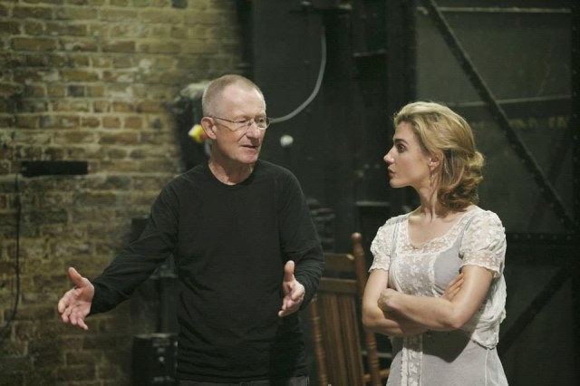 | Walter Asmus directs Lisa Dwan during rehearsals. Photo: John Haynes. |