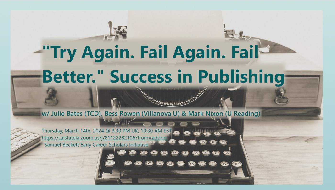 The Samuel Beckett Early Career Scholars Initiative has announced details of its latest online seminar. Titled ‘Try again. Fail again. Fail Better: Success in Publishing’, the session will share ideas on all aspects of getting published in the discipline. The event will include contributions from the Initiative’s co-organiser Julie Bates of Trinity College Dublin, as well as from Bess Rowen, Assistant Professor of theater at Villanova University and performance reviews editor at the Eugene O’Neill Review; and Mark Nixon, Professor of Modern Literature and Beckett Studies/Co-Director, Beckett International Foundation Department of English Literature at the University of Reading, co-Chief Editor of the Journal of Beckett Studies and joint series editor of the ‘Elements in Beckett Studies’ series for Cambrdige University Press.